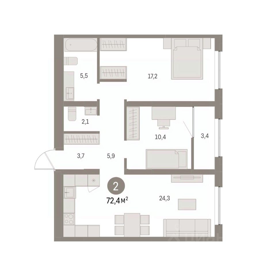 Квартира с кухней-гостиной и двумя спальнями в районе Шишимская горка. Особенности планировки: второй санузел, вид во двор, тёплая лоджия, предчистовая отделка.