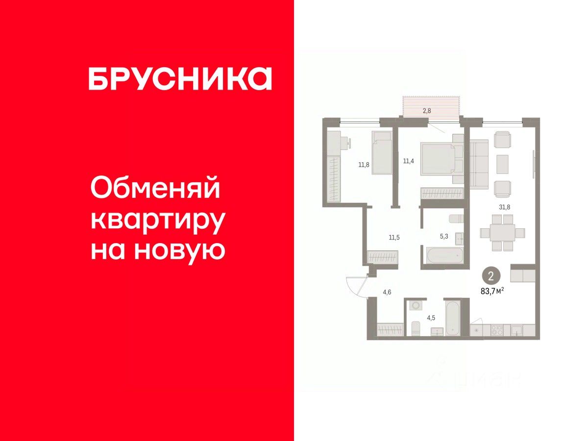 Квартира с кухней-гостиной и двумя спальнями в районе Шишимская горка. Особенности планировки: балкон, второй санузел, предчистовая отделка.