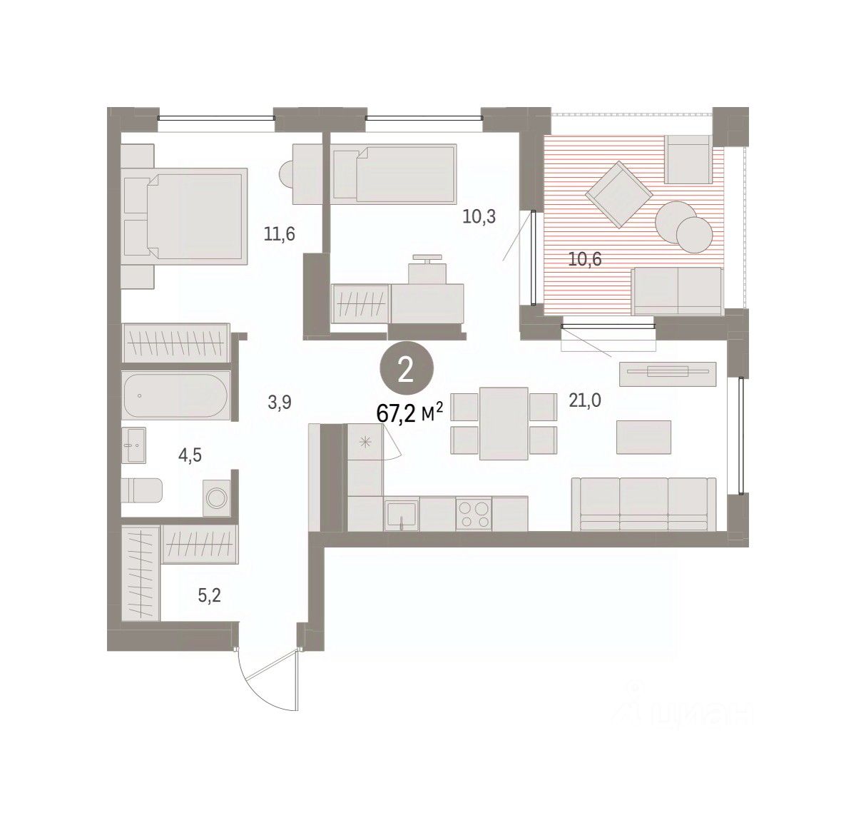 Квартира с кухней-гостиной и двумя спальнями в районе Шишимская горка. Особенности планировки: вид во двор, предчистовая отделка, терраса на крыше.