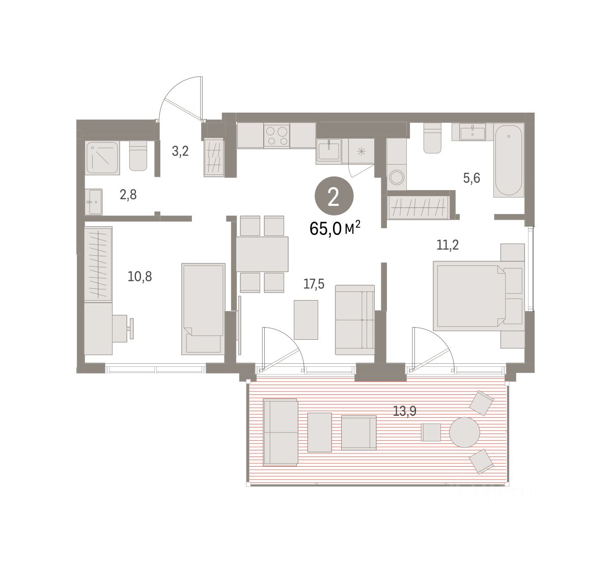 Квартира с кухней-гостиной и двумя спальнями в районе Шишимская горка. Особенности планировки: окна в пол, вид во двор, панорамное остекление, разнесённые спальни, предчистовая отделка, мастер-спальня, терраса.