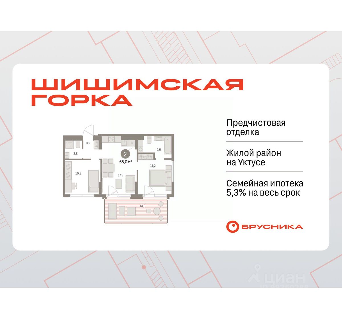 Квартира с кухней-гостиной и двумя спальнями в районе Шишимская горка. Особенности планировки: вид во двор, мастер-спальня, окна в пол, панорамное остекление, предчистовая отделка, разнесённые спальни, терраса.