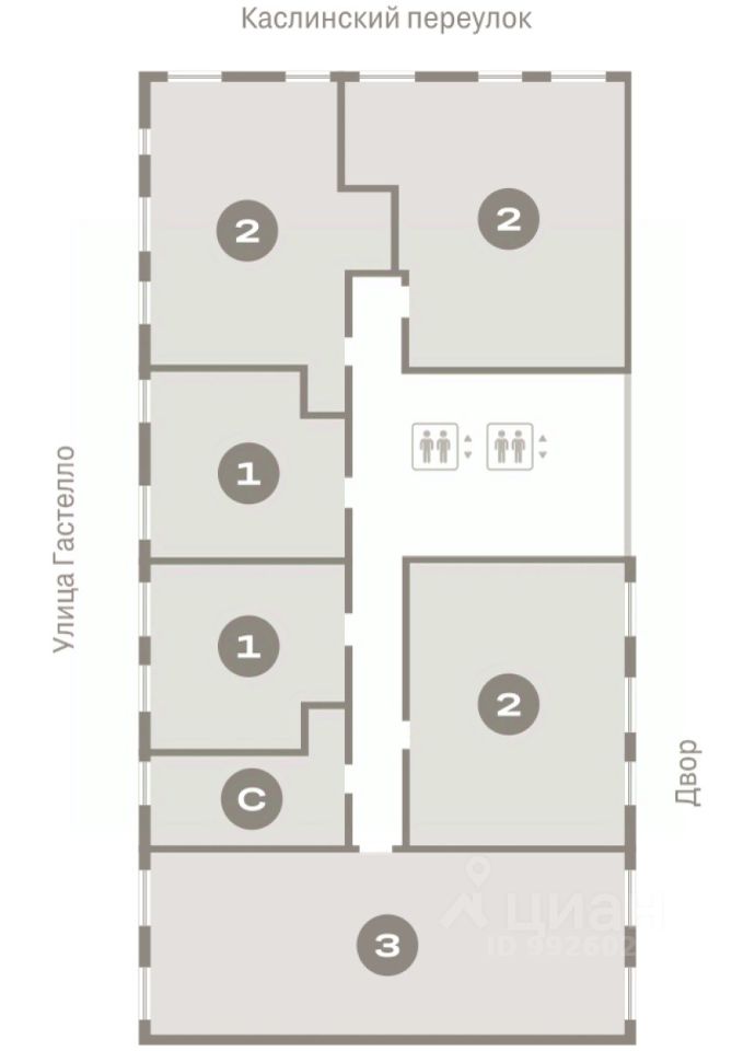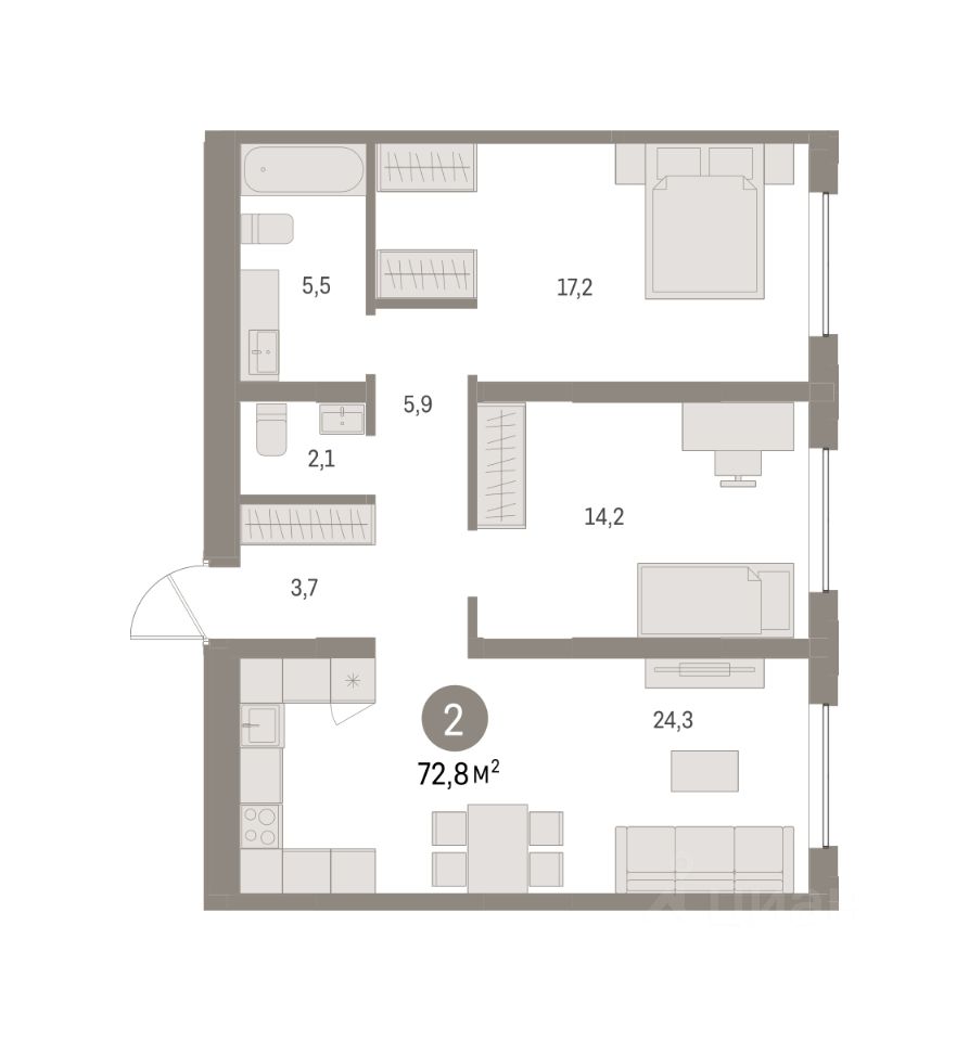 Квартира с кухней-гостиной и двумя спальнями в районе Шишимская горка. Особенности планировки: второй санузел, вид во двор, предчистовая отделка.
