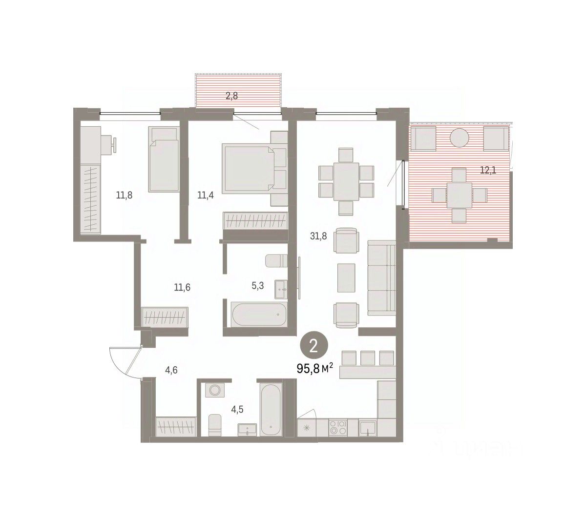 Квартира с кухней-гостиной и двумя спальнями в районе Шишимская горка. Особенности планировки: второй санузел, предчистовая отделка, балкон, терраса на крыше.