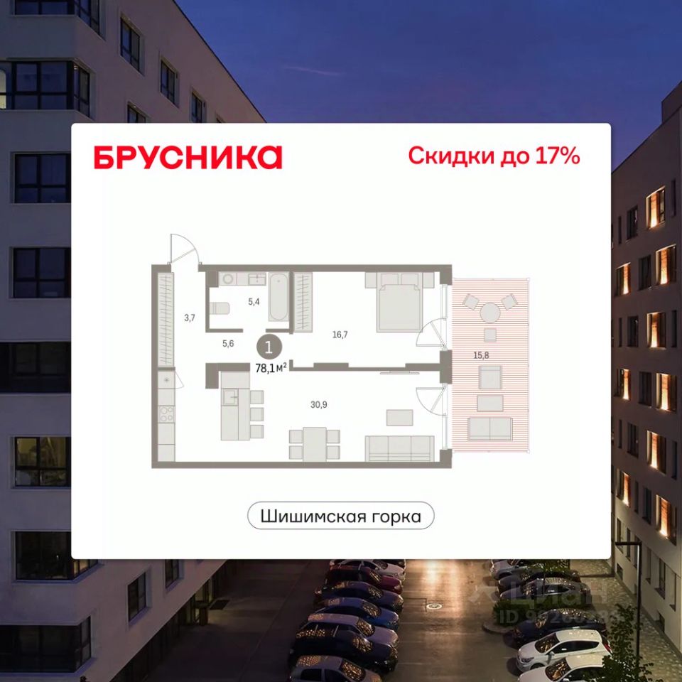 Квартира с кухней-гостиной и одной спальней в районе Шишимская горка. Особенности планировки: вид во двор, предчистовая отделка, терраса.