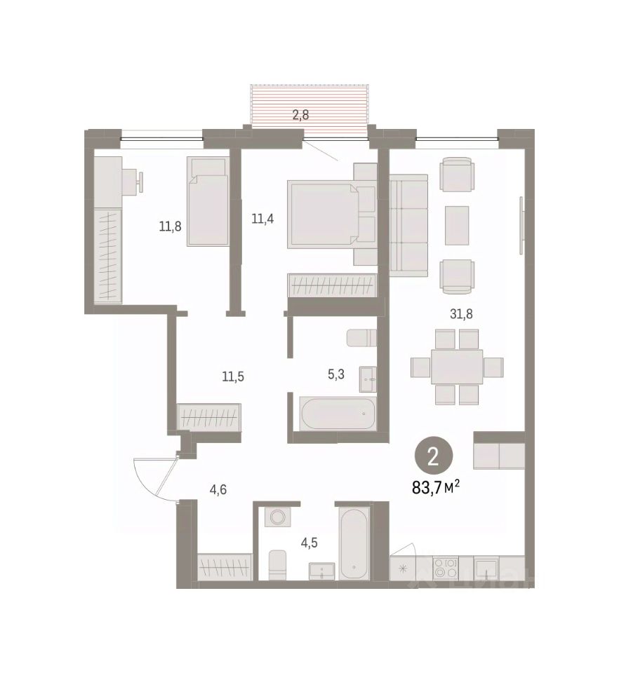 Квартира с кухней-гостиной и двумя спальнями в районе Шишимская горка. Особенности планировки: второй санузел, предчистовая отделка, балкон.