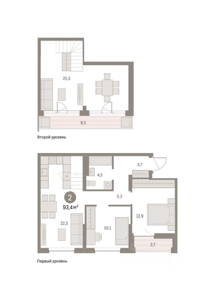 Двухуровневая квартира с кухней-гостиной и двумя спальнями в районе Шишимская горка. Особенности планировки: двухуровневая, вид во двор, лоджия, предчистовая отделка, терраса на крыше.