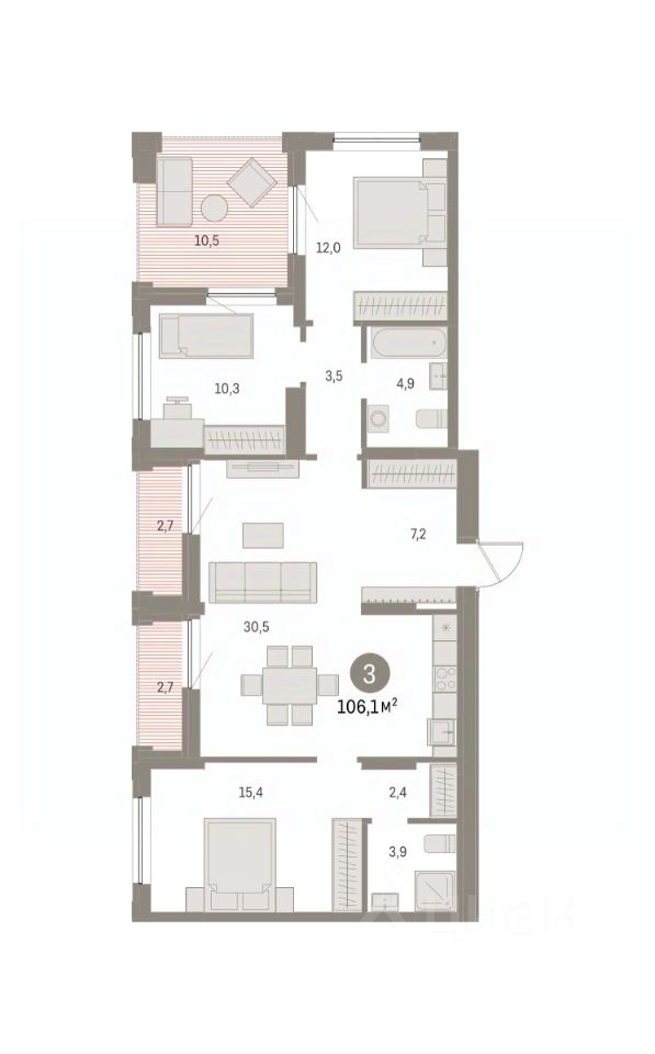 Квартира с кухней-гостиной и тремя спальнями в районе Шишимская горка. Особенности планировки: гардеробная, лоджия, разнесённые спальни, предчистовая отделка, мастер-спальня, терраса на крыше.