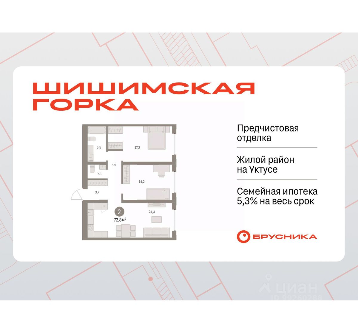 Квартира с кухней-гостиной и двумя спальнями в районе Шишимская горка. Особенности планировки: второй санузел, вид во двор, предчистовая отделка.