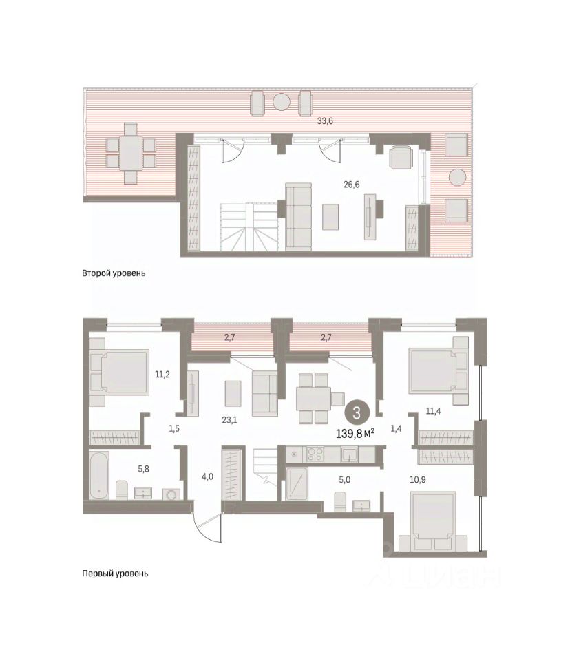 Двухуровневая квартира с кухней-гостиной и тремя спальнями в районе Шишимская горка. Особенности планировки: двухуровневая, лоджия, разнесённые спальни, предчистовая отделка, мастер-спальня, терраса на крыше.