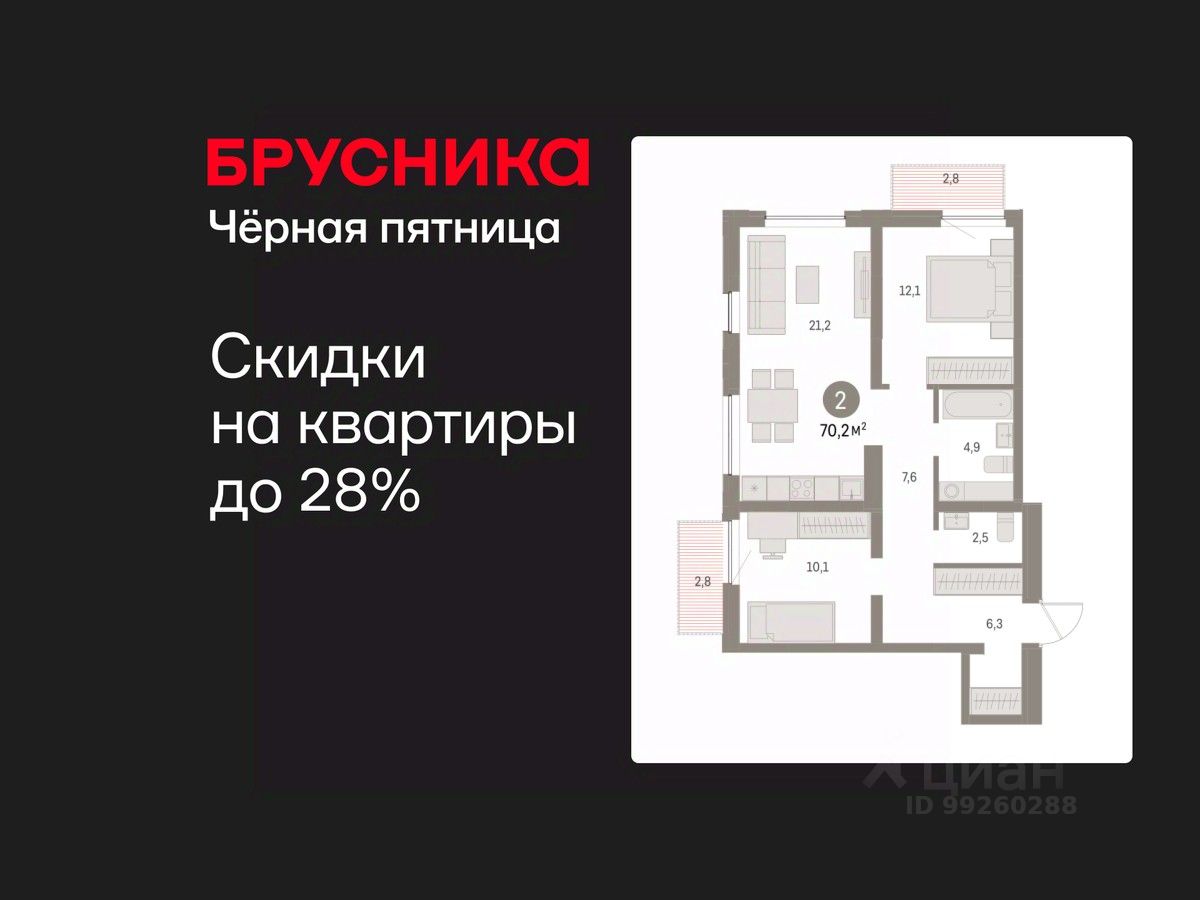 Квартира с кухней-гостиной и двумя спальнями в районе Шишимская горка. Особенности планировки: второй санузел, разнесённые спальни, предчистовая отделка, балкон.