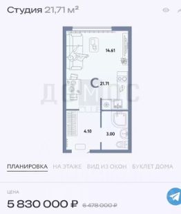 Квартира расположена на 17 этаже, что обеспечивает удобный доступ и прекрасное освещение. Общая площадь квартиры составляет 21.71 кв.м., что позволяет организовать функциональное пространство для проживания.
