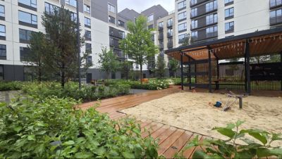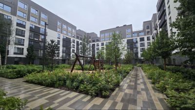 Камерные дворы квартала закрыты от машин. По стандартам 70% их территории покрывает зелень. Деревья, кустарники и травы подобраны таким образом, чтобы в каждый сезон двор оставался красивым и имел свой цвет.
