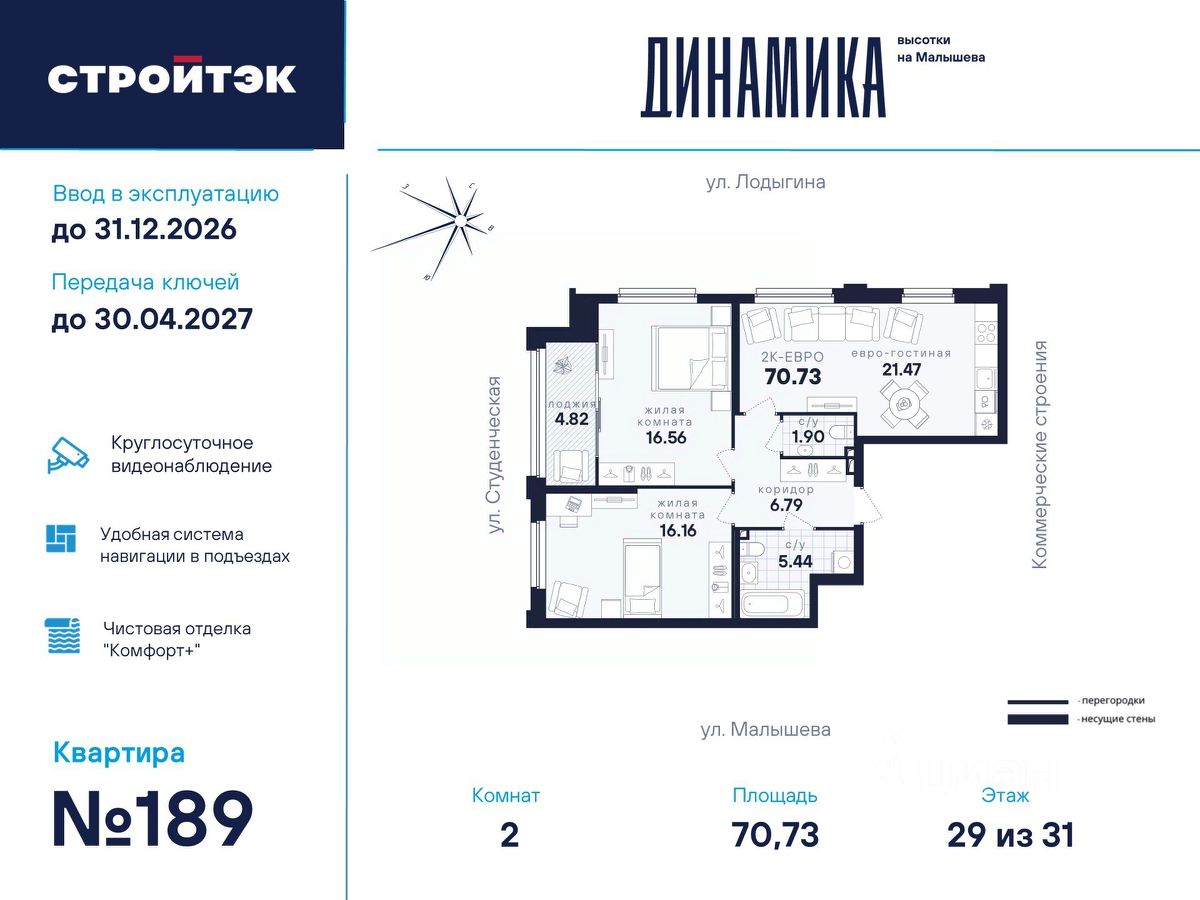 Секция 1 — башня в 31 этаж. В ней 209 1- и 2-комнатных квартир и 21 уникальная планировка — как в классическом исполнении, так и с просторными кухнями-гостиными до 22 м квадратных. Мы сдадим дом в 4 квартале 2026 года и выдадим ключи не позднее 30 апреля 2027 года.