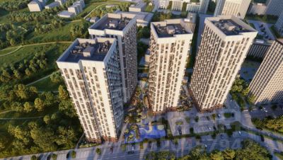 Квартал состоит из четырех 27-этажных домов. В домах — уютные студии, однокомнатные, двухкомнатные, семейные трехкомнатные квартиры. А для ценителей редких форматов квартиры с террасами. Парадный вестибюль с камином и кафе, двор с лаунж-зонами, фонтаном, сенсорным садом, детскими и спортивными площадками внутри.