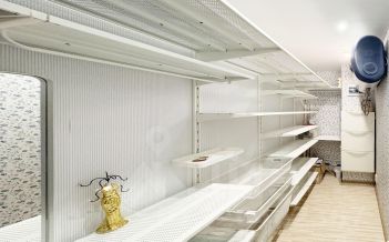 В гардеробной комнате встроенная полочная система хранения IKEA, трехуровневая обувница IKEA, установлен бойлер для подогрева горячей воды на 80 литров с нержавеющим баком.
