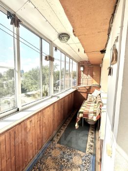 Большая лоджия с двумя выходами из кухни и комнаты, на лоджии есть электричество и зимний холодильник.