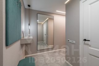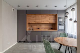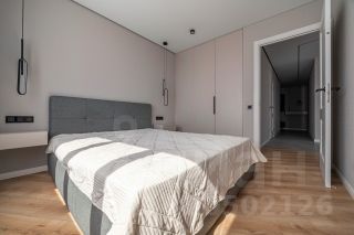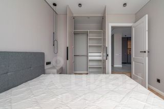 Кухонный гарнитур со встроенной техникой: холодильник, варочная поверхность, духовой шкаф, микроволновая печь, посудомоечная машина. Обеденная зона, диван, телевизор, двуспальная кровать, тумбы, встроенный шкаф - купе, стиральная машина автомат.