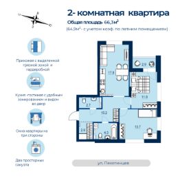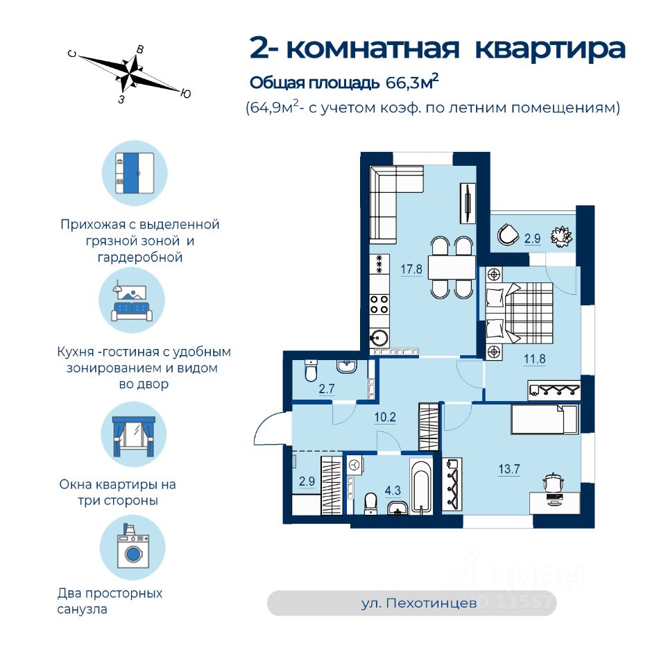 Продаётся 2-комнатная квартира в строящемся доме (Дом 1), срок сдачи: IV-кв. 2025, общей площадью 64.9 кв.м., на 11 этаже. Новый жилой комплекс "Estelle" от застройщика "СЗ Инвестстрой" расположен по адресу: г. Екатеринбург, улица Пехотинцев.