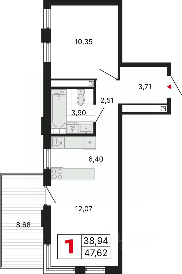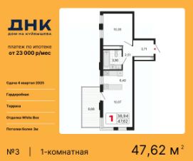 Продается однокомнатная квартира от застройщика с отделкой в ЖК "ДНК. Дом на Куйбышева" на 1 этаже. Общая площадь: 47.62 кв.м., жилая: 10.35 кв.м., площадь кухни: 6.4 кв.м. Квартира угловая, очень светлая, естественная вентиляция при открытии окон. В квартире один балкон, один совмещенный санузел. Высота потолков 2.7 м.