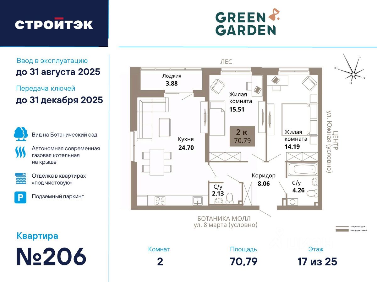 Жилой комплекс Green Garden (Грин Гарден) расположен в микрорайоне Ботанический, в сердце Ботанического сада — по адресу 8 марта, 204е. Дом сдан. Продажа квартир осуществляется по договору купли-продажи от застройщика.