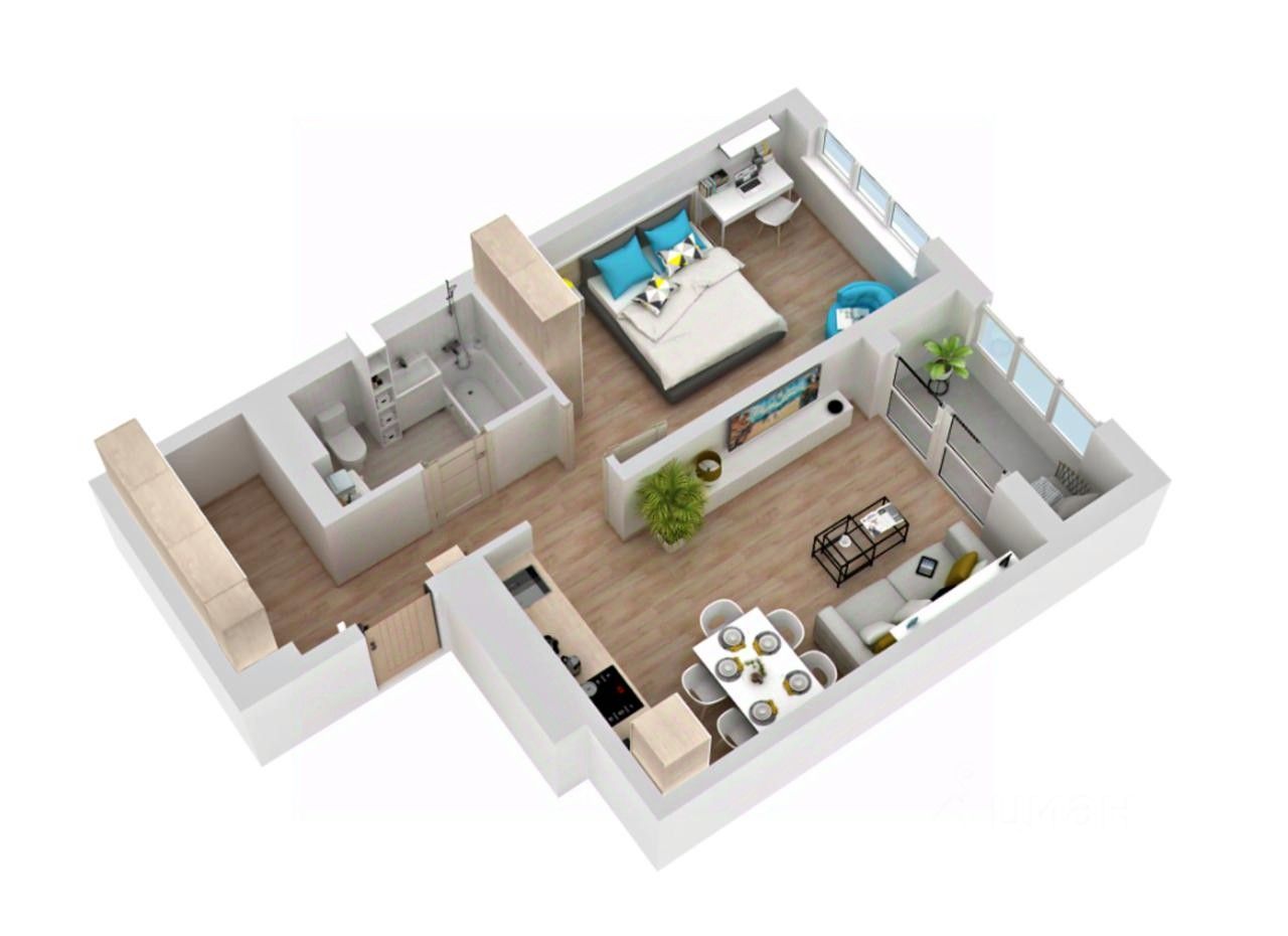 Кухня-гостиная — 17,35 м² с выходом на остеклённую лоджию 2,81 м²