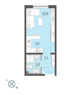 Жилая площадь 10.4 м2, кухня 5 м2, чистовая отделка. Раздельных санузлов - нет, балконов - нет, лоджий - нет.