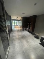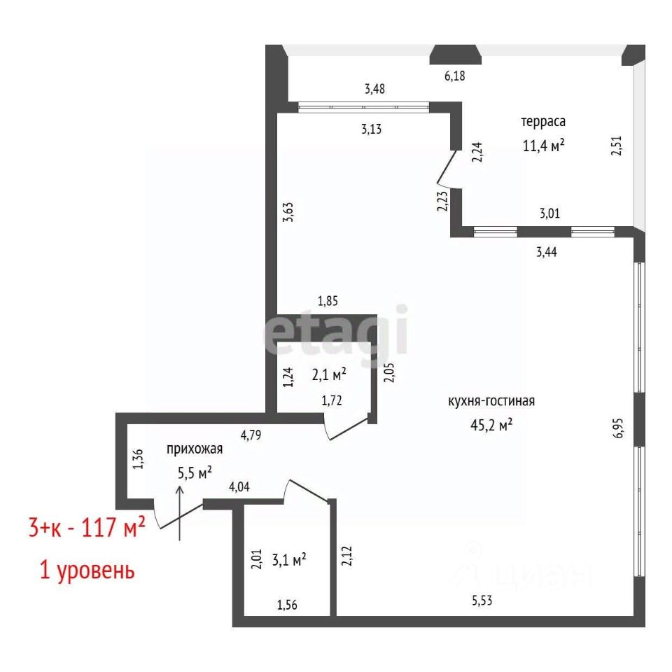 1 этаж прихожая 5.5 м2, гостевой санузел 2.1 м2, кладовая 3.1 м2, центральное помещение 45 м2, лоджия-терраса два выхода. В центральном помещении второй свет - высота потолка 6 метров.