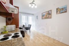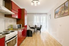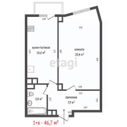 Кухня 14,6 кв.м., комната 20,4 кв.м., потолки 2,5 м., балкон с панорамным остеклением, санузел совмещенный, облицован в плитке.