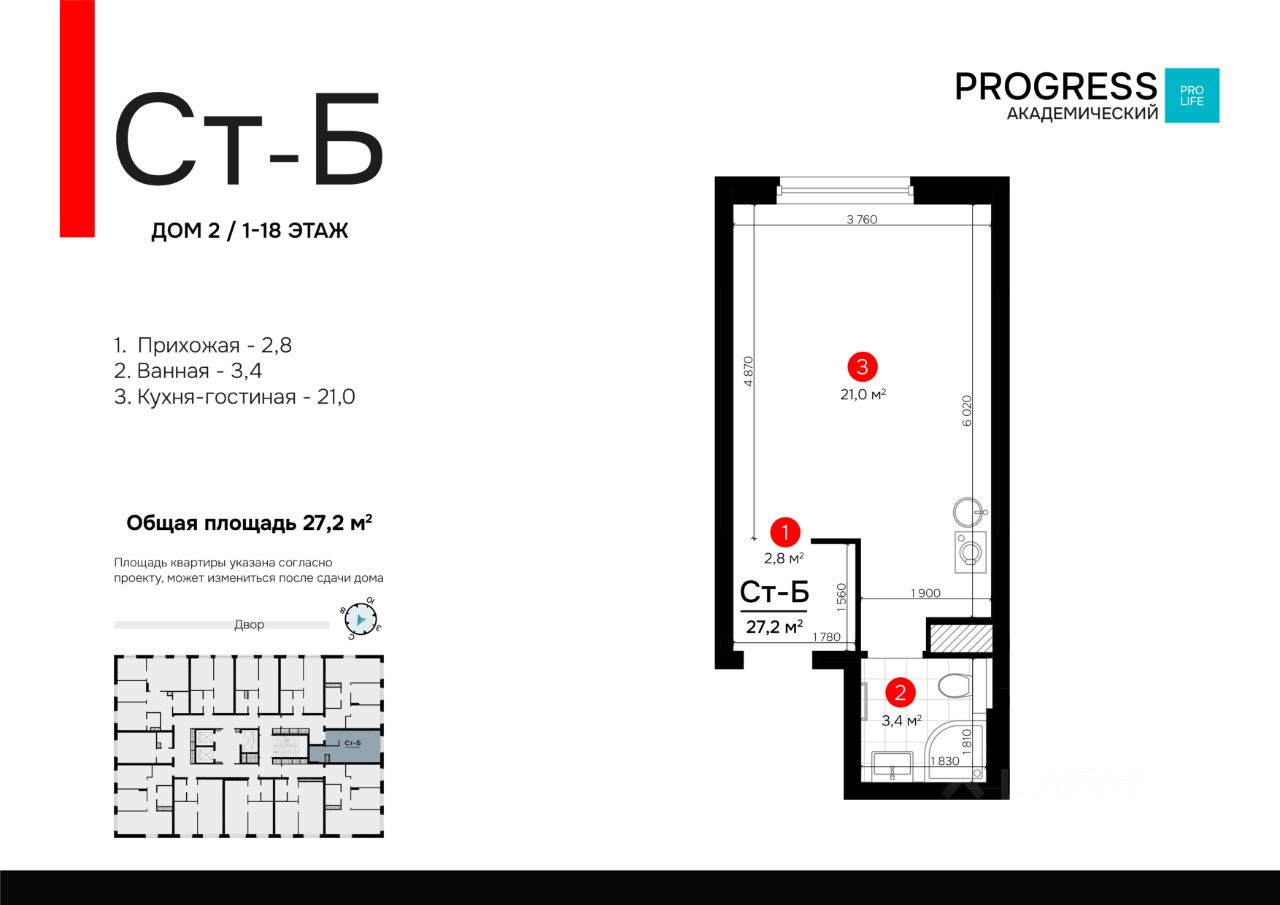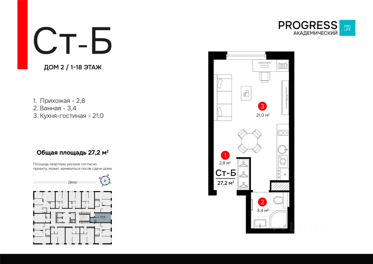 О компании: "Прогресс" — девелопер федерального уровня. Создаём современный стиль жизни с 2012 года. Совершенствуем культуру нашего общества. Предвосхищаем ваши ожидания. "Прогресс" - группа компаний полного цикла. Мы проектируем, строим и обслуживаем свои жилые комплексы. Входим в топ - 10 застройщиков по потребительским качествам ЖК по версии "Единый ресурс застройщиков". Мы - обладатель федеральных и европейских наград в сфере недвижимости: Urban Awards, European Property Awards, "Надёжный застройщик России" и др. Новый проект от создателей жилого квартала "Amundsen" "ПРОГРЕСС Академический" - это место, где безопасно и уютно. Вы прочувствуете настоящую жизнь в режиме "здесь и сейчас". Удобная локация делает этот проект максимально привлекательным для тех, кто устал от суеты и ограниченных пространств. Безопасный благоустроенный двор, умные планировки и зонирование территории все это позволит почувствовать новый уровень комфорта. Соседство с лесным массивом, улучшает качество воздуха и создает уникальное экологически чистое окружение. Умные планировки. При проектировании дома наши архитекторы закладывают систему SMART- планировок: - Только разумное распределение полезной площади, которое отвечает реальным потребностям человека. Жители экономят деньги на протяжение всей жизни, ведь используется каждый уголок квартиры. - Несущие стены вынесены по периметру квартиры. Это дает возможность осуществлять перепланировку и реализовывать свои архитектурные идеи. - Все комнаты правильной формы, что упрощает расстановку мебели. Благоустроенные дворы. Наполнение двора детально продумано, с учетом потребностей каждого жителя. Детские площадки для разных возрастов, зоны отдыха, зеленые аллеи и пешеходные дорожки. В центре двора предусмотрен амфитеатр для общих встреч жителей и больших мероприятий. Собственная сервисная компания 24/7 поддерживает чистоту территории жилого квартала. Безопасность. Комплексная безопасность является одним из главных преимуществ. Проектом предусмотрено: закрытая придомовая территория без машин и круглосуточное видеонаблюдение без слепых зон, доступ через специальное мобильное приложение. Удобная локация. Инфраструктура обеспечит комфортную жизнь каждому. Это пространство с уникальной образовательной, спортивной и культурной инфраструктурой, необходимой для развития всесторонней личности. Парки и прогулочные зоны Продуктовые магазины "Пятерочка" и "Магнит" Тренажерные залы и фитнес-клубы 4 школы 9 детских садов Остановки общественного транспорта в 10 минутах ходьбы Технические преимущества: - система очистки водопроводной воды до питьевой - система телеметрии - установлены входные двери с тепло-шумоизоляцией - радиаторы отопления - наружные стены с встроенной шумоизоляцией - фасадная дренажная система позволяет избежать затопления фасадов и образования грязевых луж. Способы приобретения квартиры: • С помощью материнского капитала • В ипотеку Забронируйте квартиру по номеру телефона офиса продаж.
