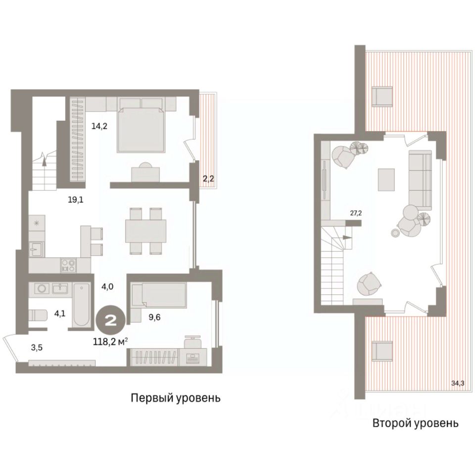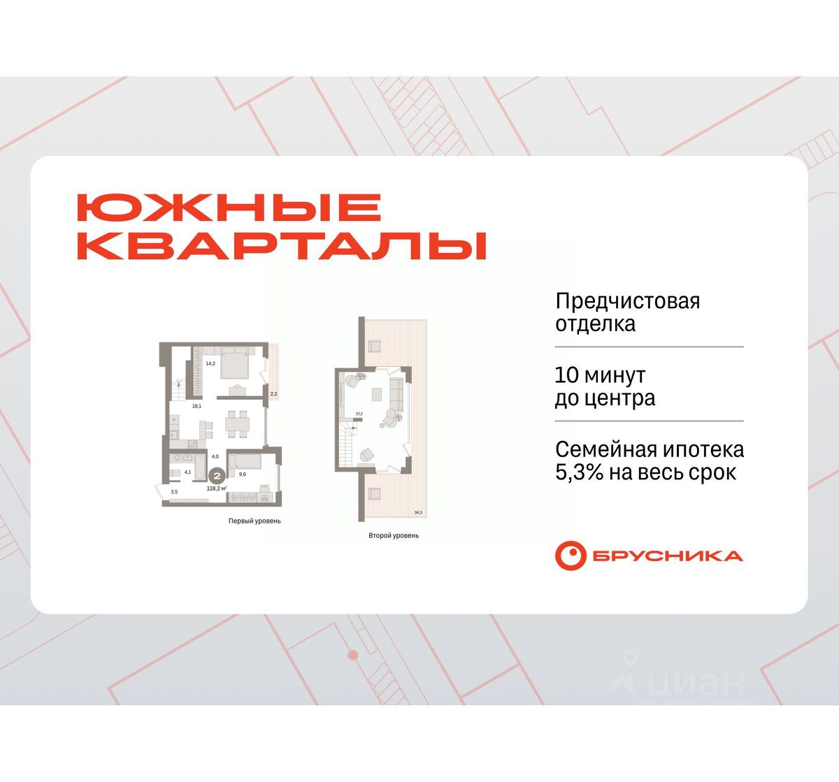 Двухуровневая квартира с кухней-гостиной и двумя спальнями в Южных кварталах. Особенности планировки: окно в коридоре, окна в пол, двухуровневая, разнесённые спальни, предчистовая отделка, терраса на крыше.