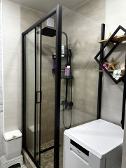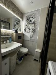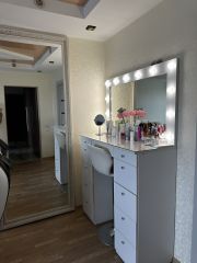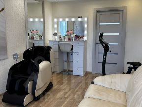 В большой комнате: мягкая мебель из натуральной кожи (не эко), массажное кресло, стол для макияжа, зеркало, велотренажёр, телевизор, саундбар, тумба под тв, стабилизатор напряжения, установлена Сплит система.