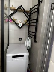 Кухня: встроенный гарнитур с каменной поверхностью, стиральная машина, посудомоечная машина, кофе машина, микроволновая печь, телевизор, стол, стулья, тёплый пол.