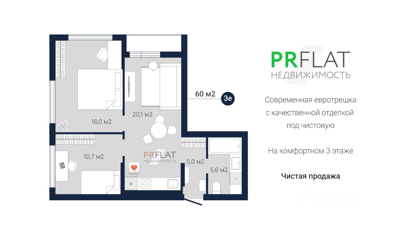 Oбщая площaдь квартиры 60 м2: просторная кухня-столовая - 20,1 м2, просторная уголовая спальня с двумя окнами - 16 м2, детская комната или кабинет - 10,7 м2, коридор - 5 м2, большой совмещенный санузел - 5,6 м2.