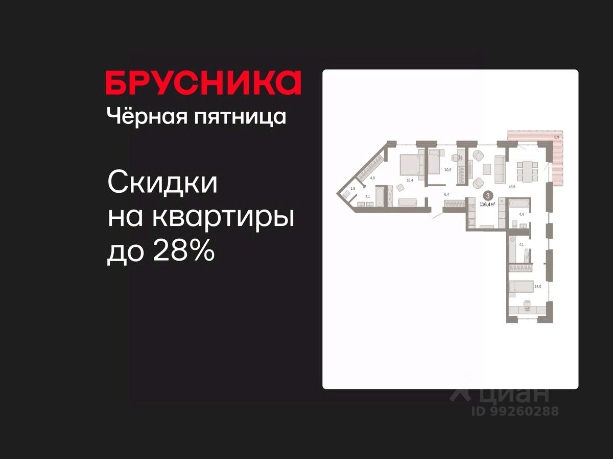Квартира с кухней-гостиной и тремя спальнями в Южных кварталах. Особенности планировки: второй санузел, гардеробная, окна в пол, вид во двор, разнесённые спальни, предчистовая отделка, мастер-спальня, постирочная, балкон.