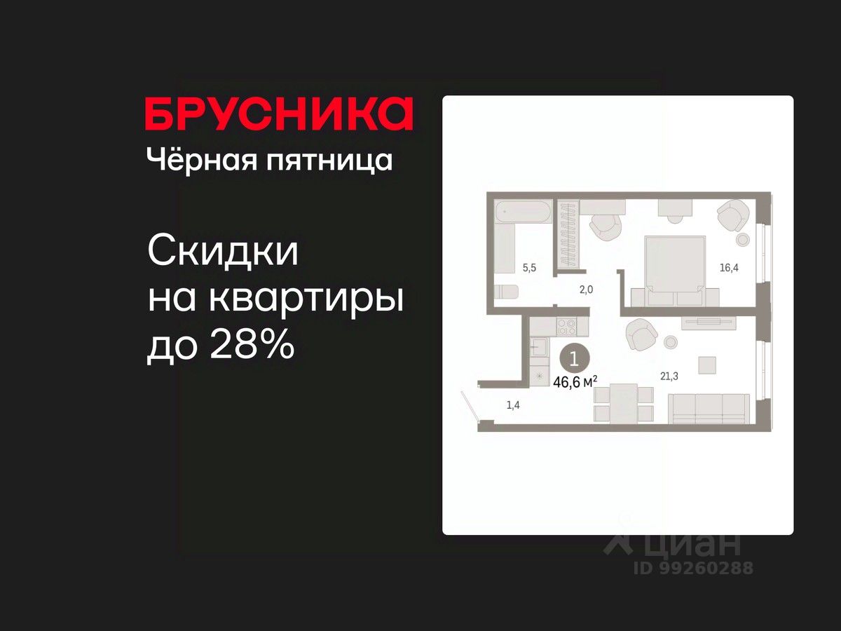 Квартира с кухней-гостиной и одной спальней в Южных кварталах. Особенности планировки: предчистовая отделка.