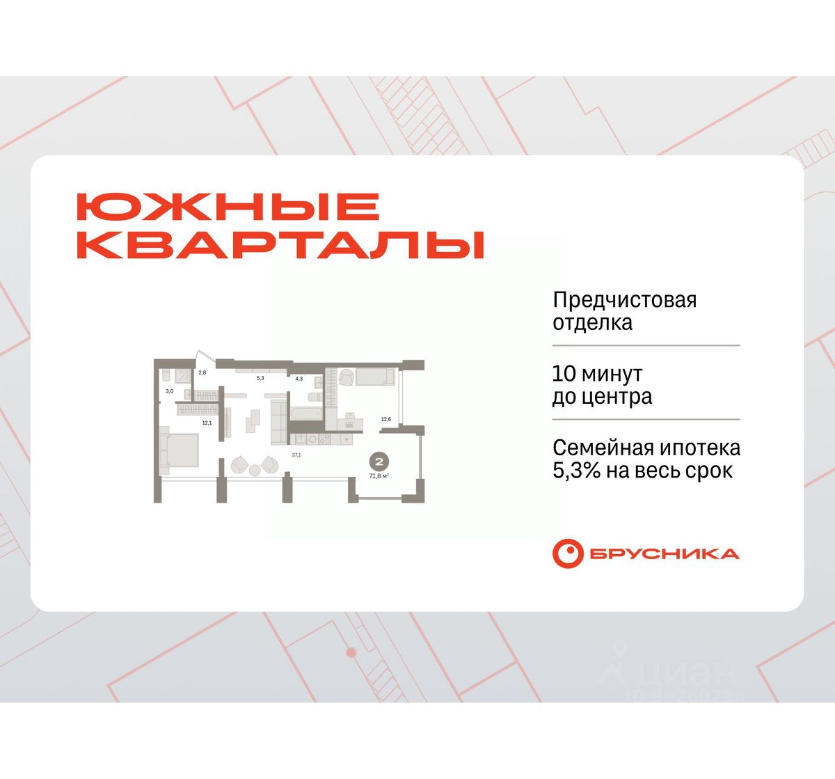 Квартира с кухней-гостиной и двумя спальнями в Южных кварталах. Особенности планировки: предчистовая отделка, мастер-спальня.