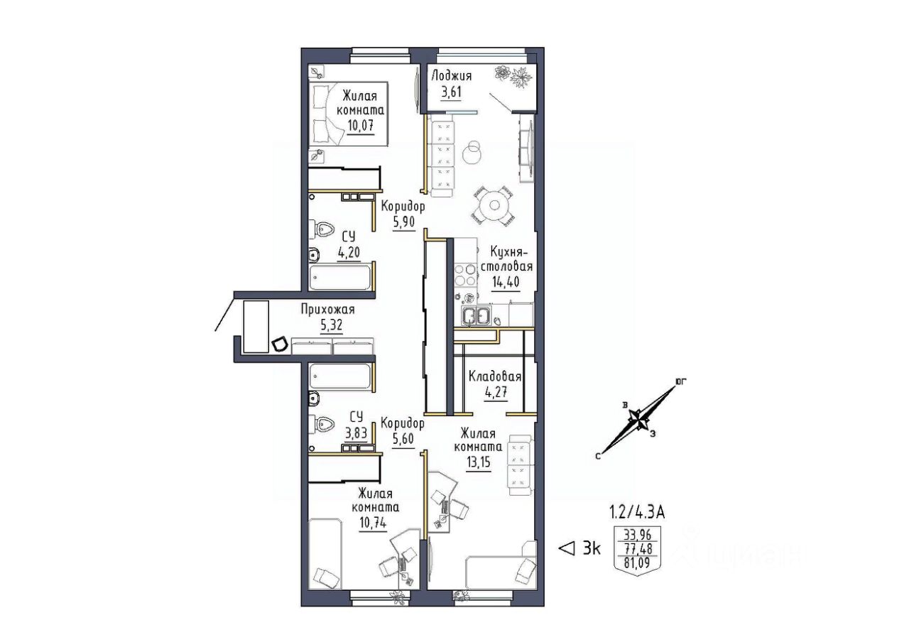 Продаётся 3-комнатная квартира в сданном доме (Тюльпановая, 11 (Дом 11)), срок сдачи: III-кв. 2024, общей площадью 81.09 кв.м., на 2 этаже. Вторая очередь строительства