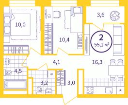 2-комн. квартира с отделкой в ЖК "Астон.Сезоны" на 20 этаже. Общая площадь: 53.26 кв.м., жилая: 20.4 кв.м., площадь просторной кухни-столовой: 16.3 кв.м. Комнаты изолированные, все окна выходят на одну сторону. В квартире одна лоджия, один совмещенный и один раздельный санузел. Высота потолков 2.7 м.