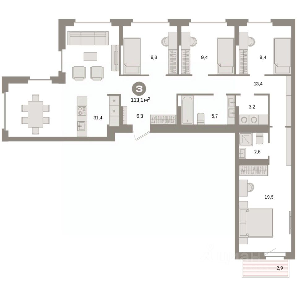 Квартира с кухней-гостиной и четырьмя спальнями в квартале "Депо". Особенности планировки: второй санузел, рабочий кабинет, разнесённые спальни, предчистовая отделка, мастер-спальня, постирочная, балкон.