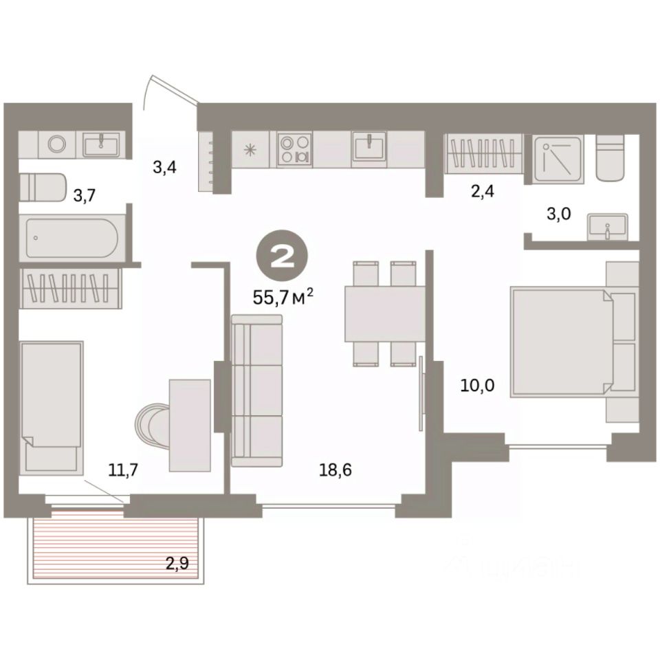 Квартира с кухней-гостиной и одной спальней в квартале "Депо". Особенности планировки: второй санузел, гардеробная, разнесённые спальни, предчистовая отделка, мастер-спальня, балкон.