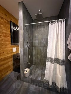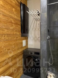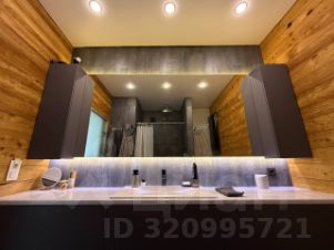Ванная с раковиной и зеркалом во всю стену, бойлером, тропическим душем и стиральной машиной. В ванной комнате установлен тёплый пол.