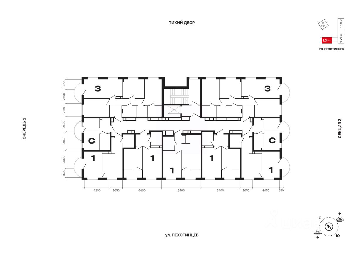 1 дом (три секции): от 8 до 12 этажей