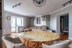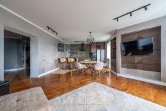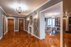 Удобная и функциональная планировка квартиры отвечает даже самым современным стандартам. Приходите к нам и посмотрите как действительно просторны все помещения. Это холл-прихожая, три изолированных комнаты и кухня-гостиная, малый санузел с душевой кабиной - из него вход в сауну, второй санузел с ванной, кладовая и гардеробная, два балкона и лоджия.
