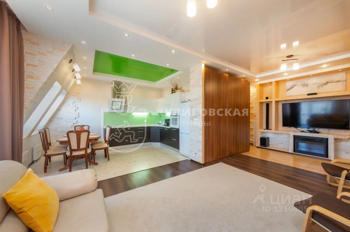 Квартира расположена на 4-м этаже малоэтажного дома. Высокие потолки 3,3 м и мансардные окна наполняют пространство воздухом и светом. Планировка продумана для семьи: большая кухня-гостиная, где удобно собираться вечерами, спальня, детская комната, гардеробная, ванная и отдельный гостевой санузел.