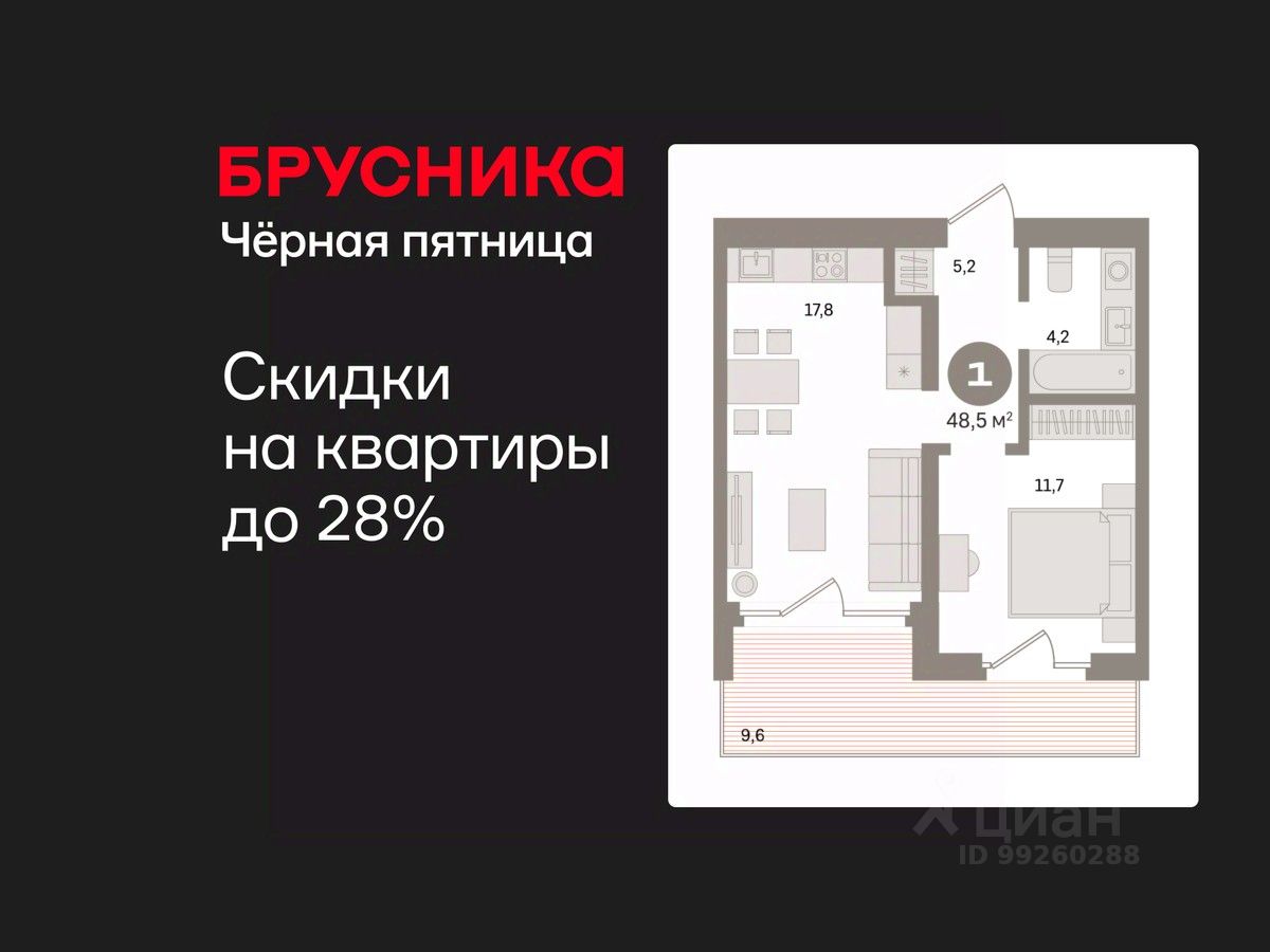 Квартира с кухней-гостиной и одной спальней в Южных кварталах. Особенности планировки: предчистовая отделка, балкон.
