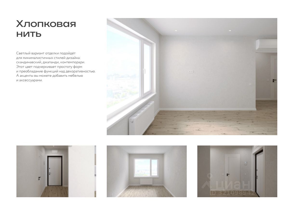 Квартира будет с отделкой от застройщика в стиле "Хлопковая нить": уютные бежевые оттенки стен и пола создают теплую атмосферу, натяжные потолки добавляют современности. Полностью должна быть выполнена отделка санузла в стиле под "Бетон" — практично и эстетично. В кухне-гостиной установят кондиционер для вашего комфорта.
