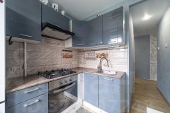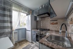 Покупателю остается кухонный гарнитур со встроенной техникой: газовая плита, духовой шкаф, вытяжка.