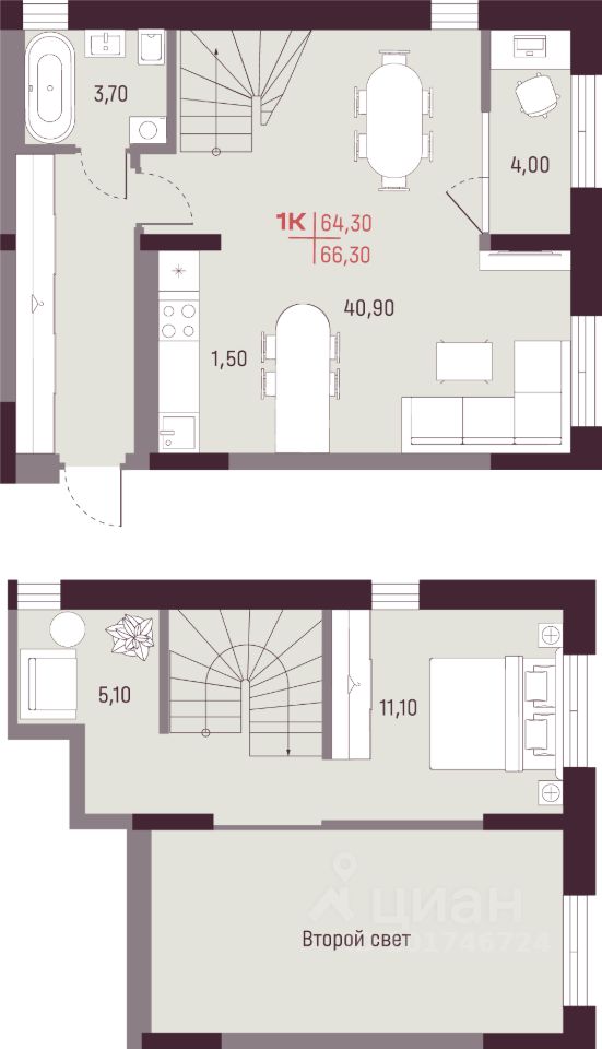 Двухуровневая однокомнатная квартира с дизайнерской отделкой. Просторная кухня-гостиная. Высота потолков 5.75 метров.