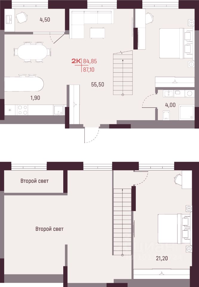 Двухуровневая однокомнатная квартира с дизайнерской отделкой. Просторная кухня-гостиная. Высота потолков 5.75 метров.