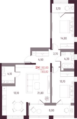 Евро 3х комнатная квартира с отделкой WhiteBox. Просторная кухня гостиная с выходом на лоджию. Обе спальни имеют выход на лоджию.
